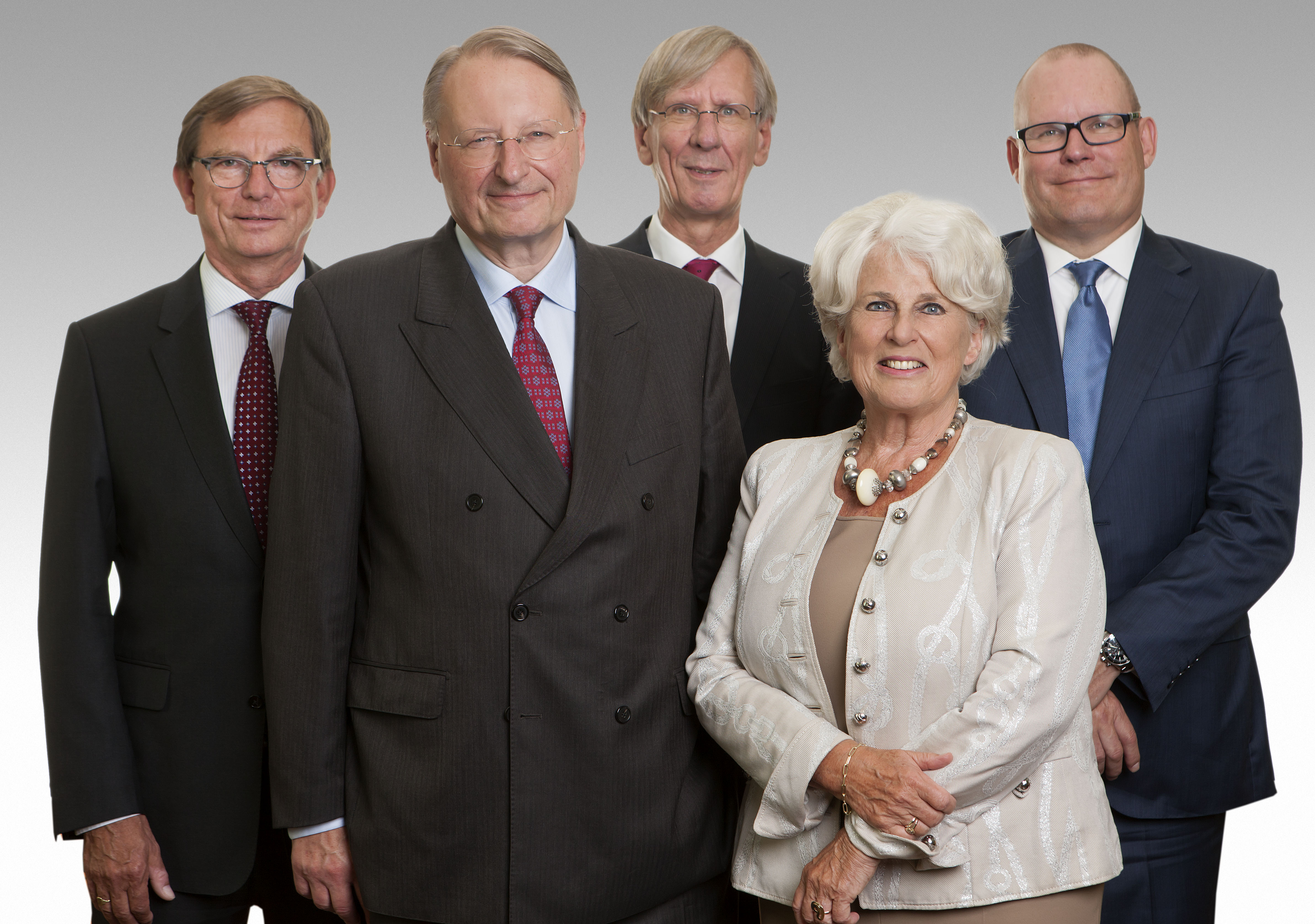 Raad van commissarissen. Van links naar rechts; de heer Raué, de heer Elverding, de heer van Halder, mevrouw Peijs, de heer van der Ende.